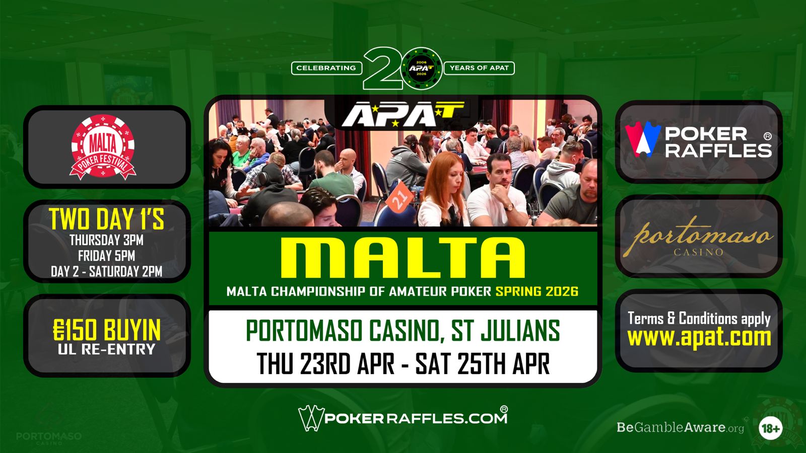 | Thu 23 Apr 3pm tbc | APAT Malta Open Championship Day 1A | €125+€25 – 100k stack - 25 mins | Late Reg & Re-entry for 10 Levels |