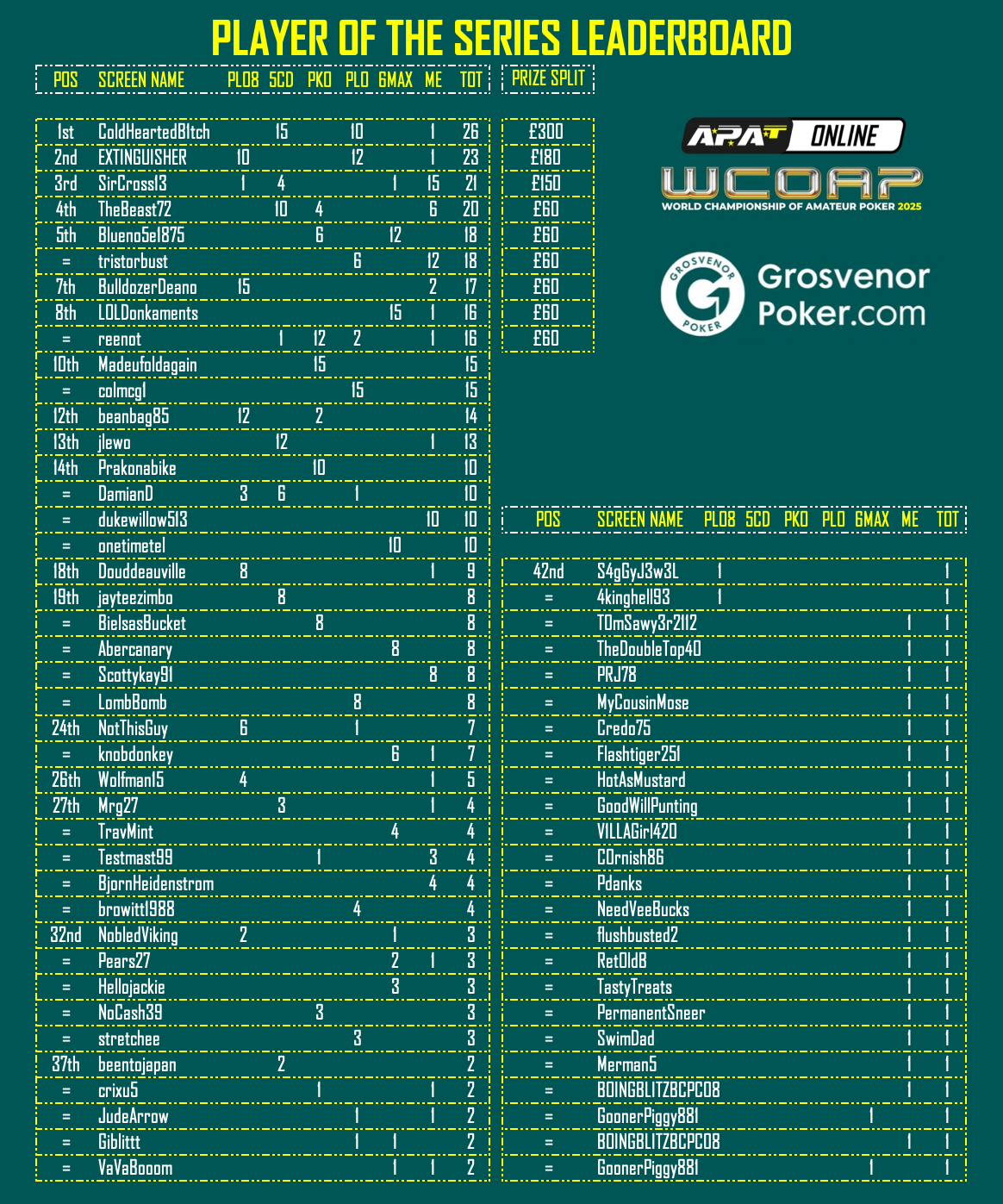 | Saturday 25th October 2025 | 19:30 | WCOAP Online PLO Championship | £5 | To Finish |