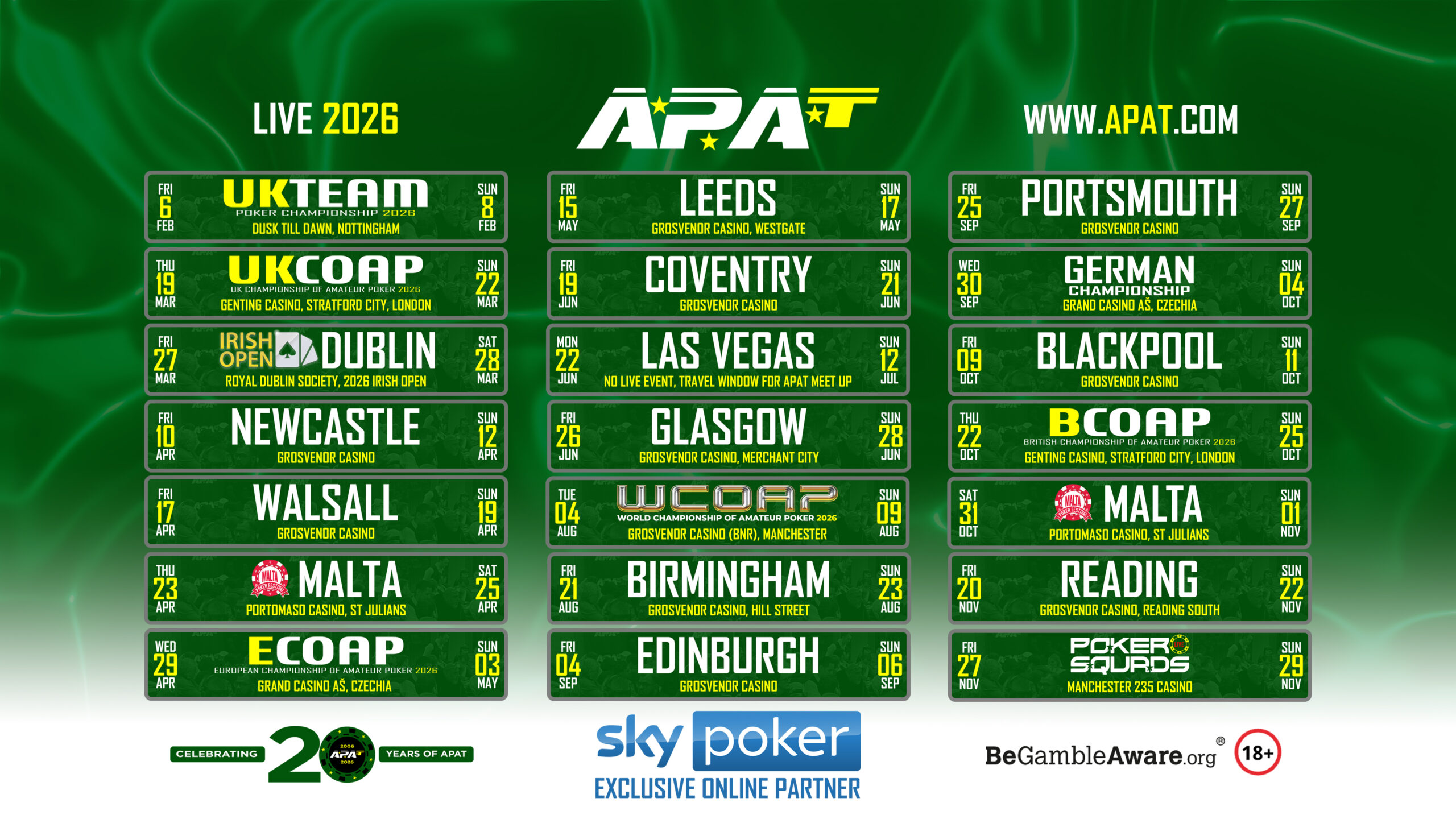 | Jun Fri 19 -Sun 21st | Coventry, Grosvenor Casino | APAT Coventry | Fri 6pm ME 1A £140 Sat 3pm ME 1B £140 Sat 9pm ME 1C £140 Sun 1pm ME D2 Sun 3pm NLHE £140 Sun 8pm NLHE £70 |